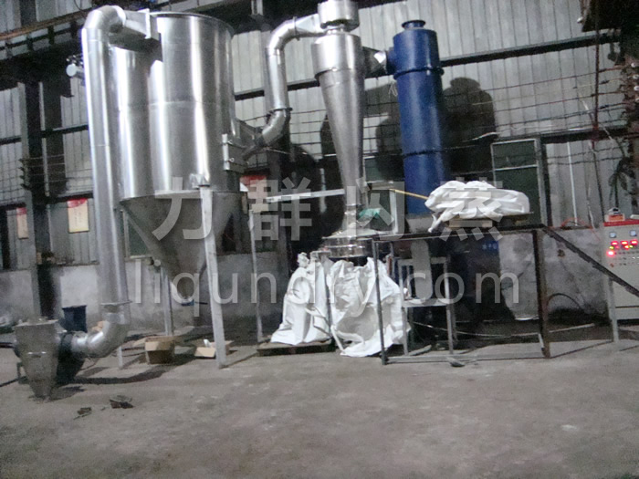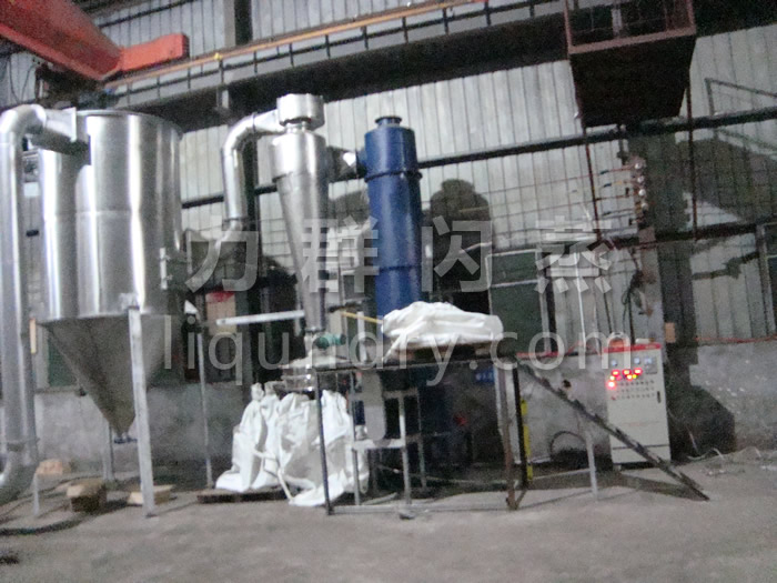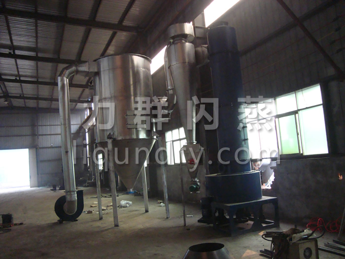 2、工作原理: 經(jīng)換熱器加熱后的潔凈空氣被鼓入進(jìn)風(fēng)口,以適宜的速度旋入干燥室底部的環(huán)隙,然后按切線方向進(jìn)入干燥室,并呈螺旋狀上升:同時(shí),物料則由可無級(jí)調(diào)速的加料器定量加入塔內(nèi)。在干燥塔內(nèi),物料與熱空氣進(jìn)行充分、高效的質(zhì)熱變換,被干燥的粉狀物料隨同熱風(fēng)一起輸送至分離器,其中成品收集包裝,而尾氣則進(jìn)一步經(jīng)除塵裝置處理后排空。